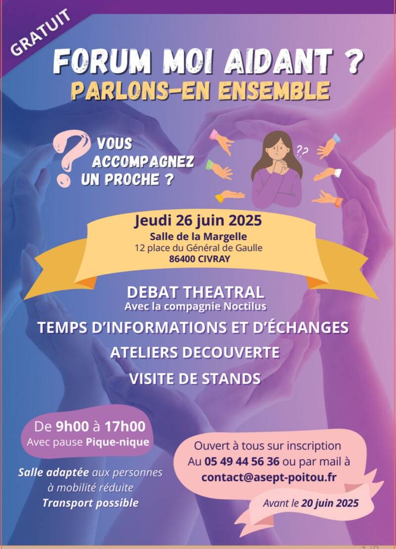 Venez nombreux a nous rendre visite lors du forum MOI AIDANT a Civray le jeudi 26 juin a partir de 9h....